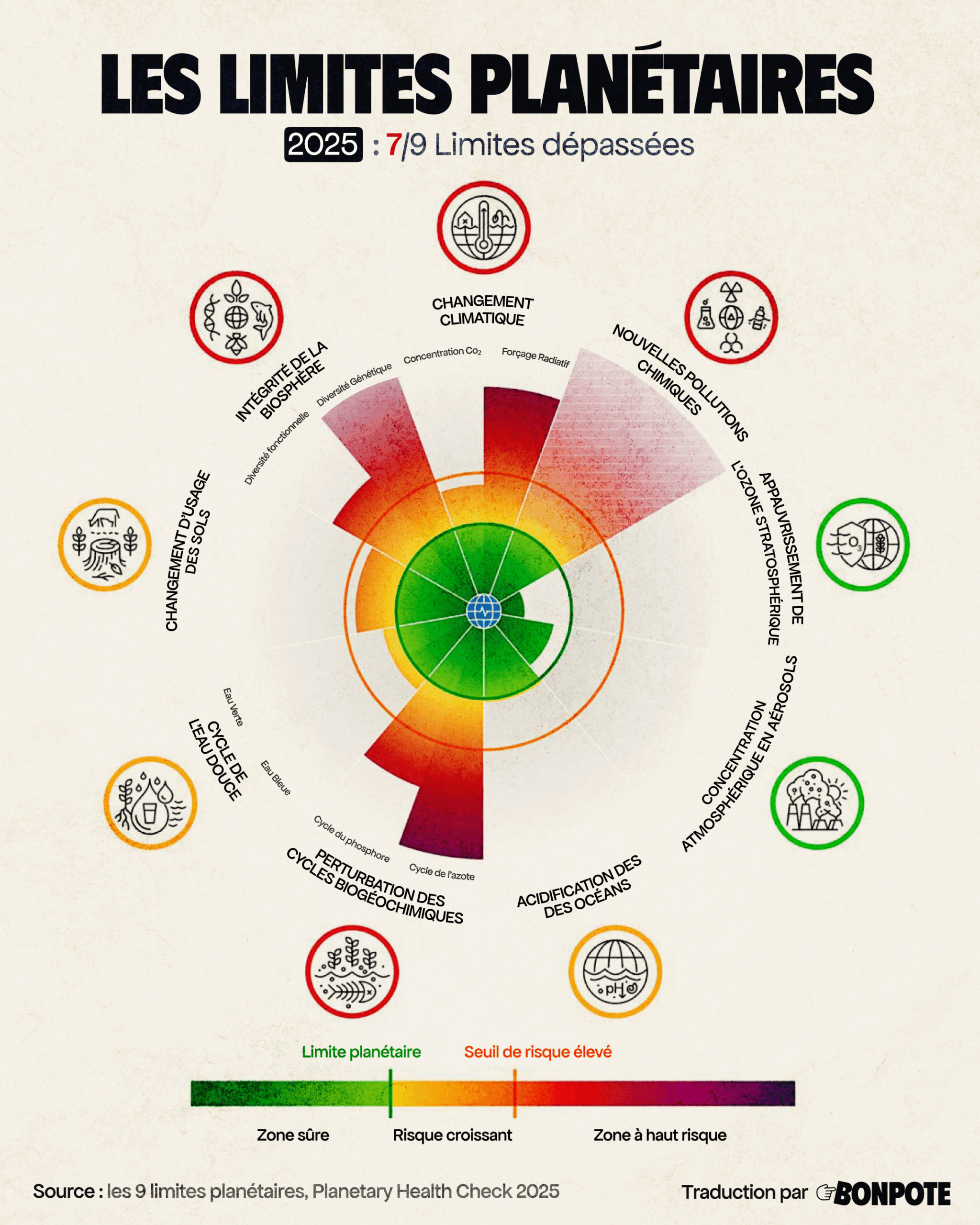A la lecture des rapports scientifiques, GIEC, IPBES, et autres, le constat est clair : 7 des 9 frontières planétaires sont dépassées et le jour de dépassement de la Terre arrive de plus en plus tôt. Les conséquences se font ressentir : des évènements climatiques extrêmes, avec des bilans humains et matériels en augmentation, des forêts qui souffrent, des récoltes incertaines, des tensions et conflits pour les ressources, des liens de causalité entre santé et pollutions qui apparaissent.